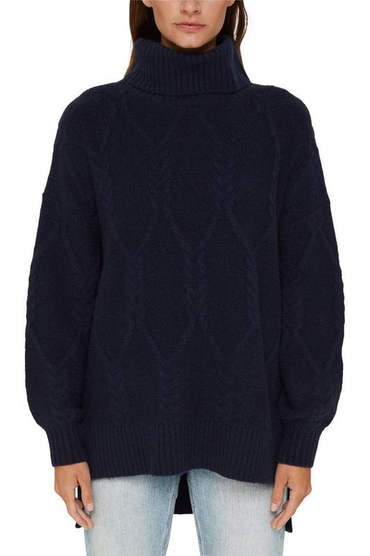 Свитер темно- синего цвета, ажурная вязка, размер M, на S тоже хорошо подойдет, ворот стойка, по бокам небольшие разрезы. Длина рукава от горловины 57 см, ПОГ 52 см, длина свитера от плеча спереди 60 см, по спинке 67 см.