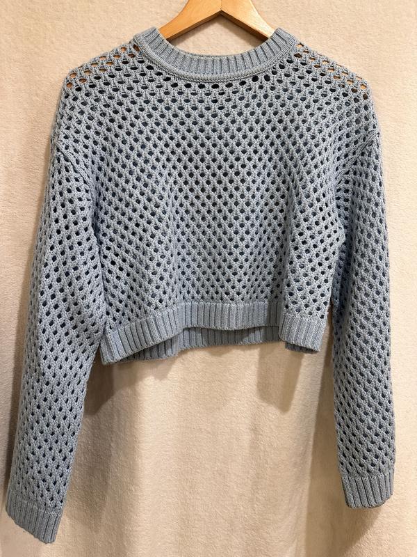 Это женский свитер светло-голубого цвета. Имеет укороченный фасон и длинные рукава. Свитер изготовлен из мягкой, приятной на ощупь пряжи, что обеспечивает комфорт при носке.