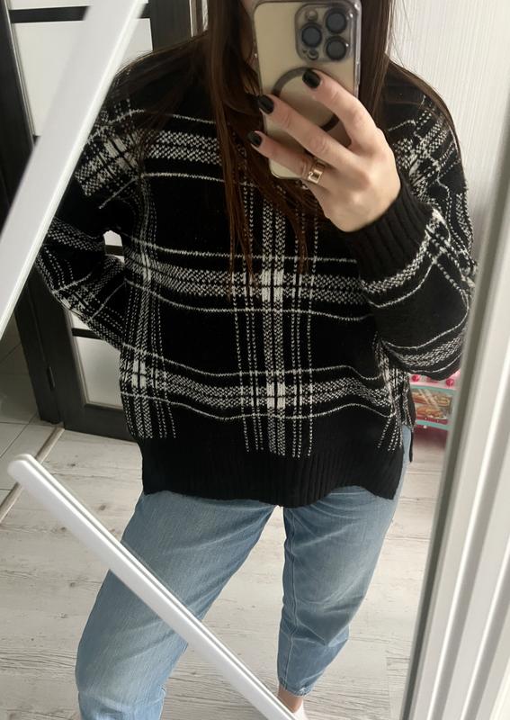 Очень классный теплый свитер в клетку в идеальном состоянии. Сбоку есть разрезы. Состав смотрите на фото. Свитер пухленький, но не тяжелый, очень теплый ❤️ Размер L Плечи -59 Рукав-48 Рукав от шеи -72 ПОГ-57 Длина по спинке-59 (+3см воротник)