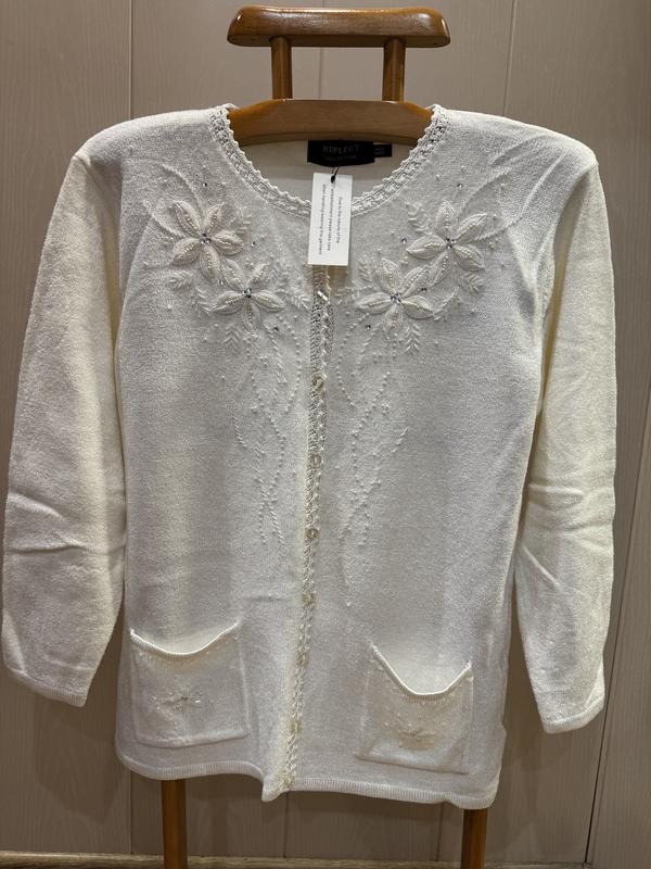 В наличии красивая кофточка фирмы REFLECT Collection. Размер указан M/L, но по замерам больше идёт на 14. Состав: 35% вискоза, 50% акрил и 15% нейлон...ткань мягкая и приятная к телу, хорошо тянется. ПОГ-55+ещё тянется, длина-66, плечи-46, длина рукава-55, ширина по низу-56+ещё тянется.