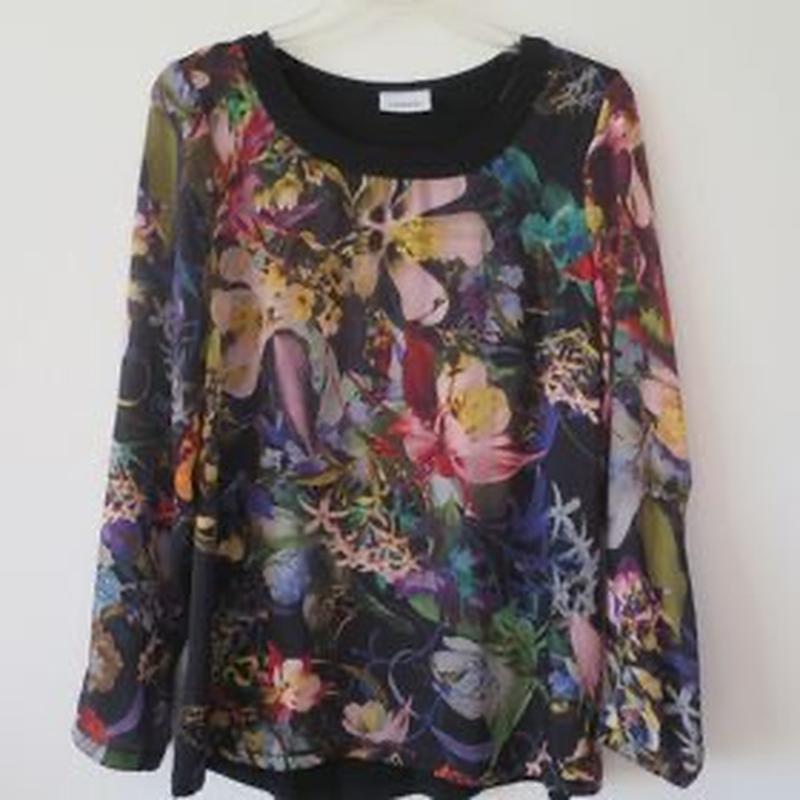 Красивая кофта блуза CANDA54-56 спинка трикотаж футболочный а спереди блузочная ткань и рукав такой,рукав имеет небольшой патент и застегивается на пуговицу можно поднять рукав сделав короче с помощью лямки и застегнуть на пуговицу состояние хорошее все на фото замер пог 62-63см низ 70-71см длина 71см длина рукава 60см свободное состояние