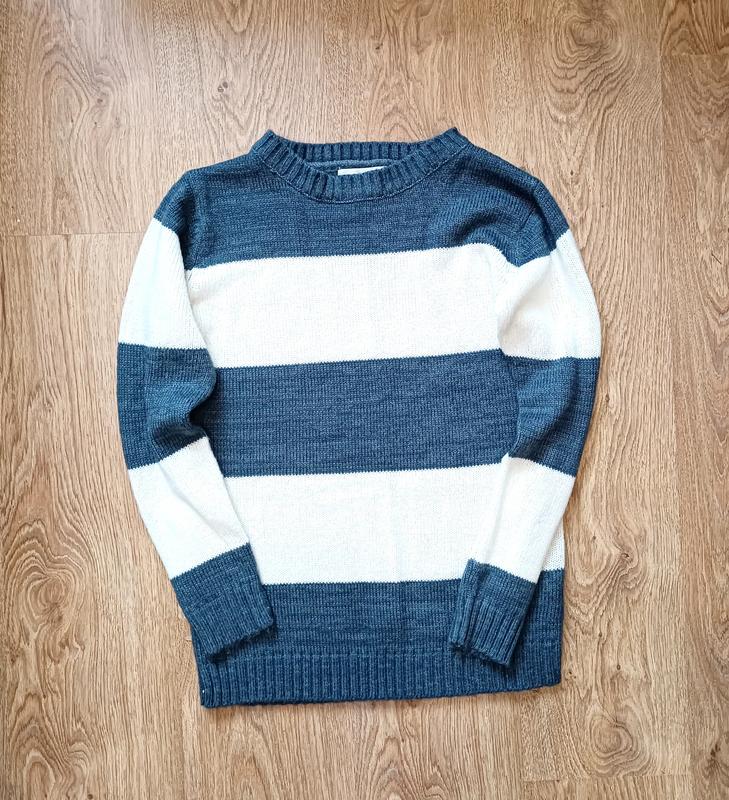 Теплый, мягкий свитер в идеальном состоянии без дефектов. Цвет молочная полоска и цвет джинс. Мягкий, приятный на ощупь.