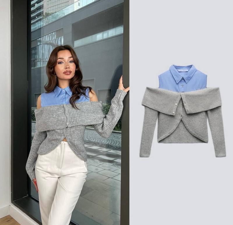 Комбинированные кофточки с верхом рубашки, очень стильные и трендовые ▫️Высокое фабричное качество, Турция 🇹🇷 ▫️Размер единый 42-46 Ширина 48 см Длина 43 см Рукав 55 см мод.ej