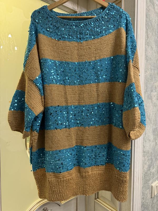 Невероятная кофта ручной вязки, стиль оверсайз. Длина 66/86. Спинка удлинена. Отлично подойдет на СМ Л ХЛ. Пог 85. Состав нитей хлопок с пайеткой, шерсть.