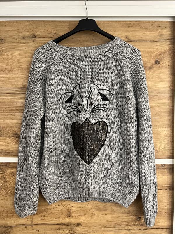 Вязаный теплый свитер серого цвета свободного кроя Спереди стразы + пайетки Размер: 38/40 Стан: 7/10