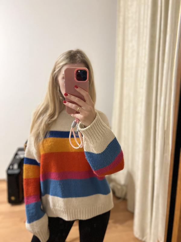 Дуже теплий , якісний та яскравий светр, гарний стан, розмір оверсайз , надягнутий на S, підійде і на М, на зрості 170.