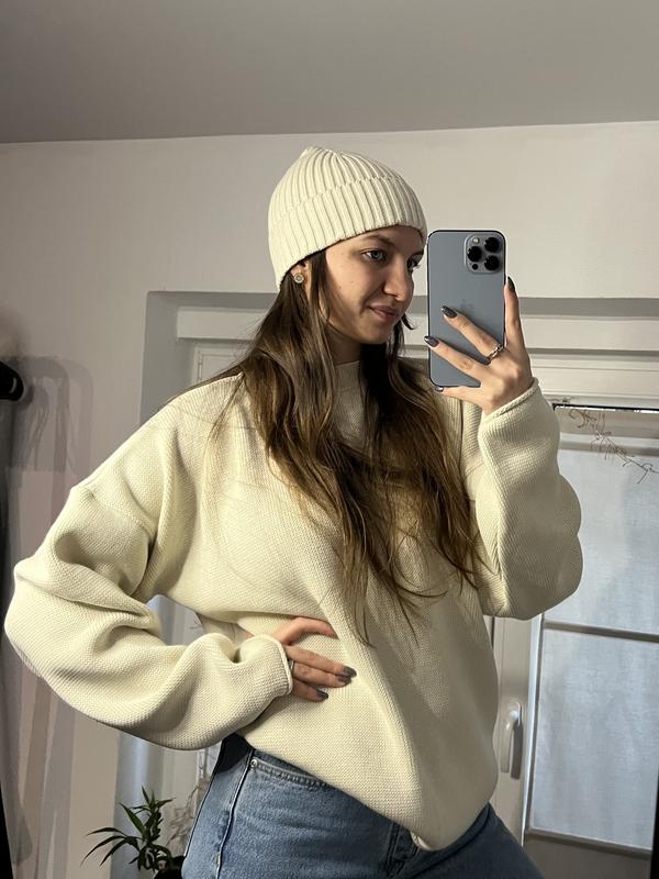 Свитер кремового цвета, размер универсальный. Очень удобный и мягкий материал, приятный на ощупь. Идеальна подходит к любым классическим брюкам, джинсам или нашим трикотажным брюкам (есть отдельно в продаже или вместе в комплекте). Они идеальны для многих случаев, их можно носить дома, в путешествии, на работу или на зимние прогулки. Размеры: • общую длина - 56 см •ширина под подмышками – 60 см х2 •длина рукава - 50 см •грешность +/- 2 см ❤️Способ стирки Стирать при 30°C, не отжимать.