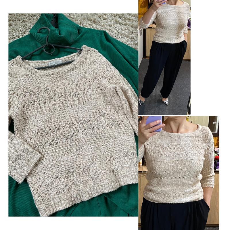 Актуальный вязаный свитер в бежевом цвете,рукав 3/4,гарный состав коттон/мохео/шерсть/акрил. Стан - идеальный Размер указан 10,на фото на 12 и рост 170 Замеры Плечи 39 Рукав47 Пог 49+ Пот 46 Поб 46 Длина 64