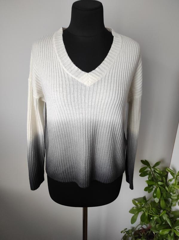 Полувер свитер оверсайз в рубчик лапша градиент 6 р от topshop Размер - 6 (по бирке), очень большемерит Цвет - белый градиент к черному 100 % акрил Длина по спинке - 63 см, Длина переда - 53 см, пог - 57 см, низ - 57 см, рукав- 49 см, плечо - 22 см.