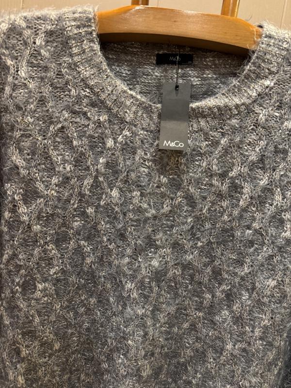 В наличии красивый свитер фирмы M&Co. Размер указан 20, но по замерам лучше сядет на 18. Состав: 54% акрил, 38% нейлон, 5% полиестер и 3% металисед...нитка очень мягенькая и приятная к телу, хорошо тянется. ПОГ-56+ещё очень хорошо тянется, длина-65, плечи-43, длина рукава-64, ширина по низу-59+ещё хорошо тянется.