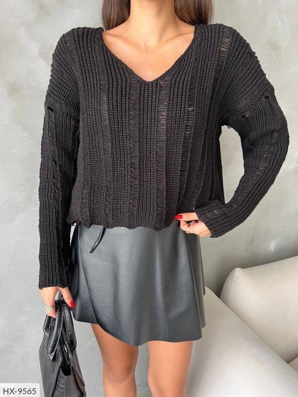 Светр HX-9564 модель 1218 Розмiри: 42-50 Виробник Туреччина Стильний светр з актуальним дірочками. Крій оверсайз, спущене плече, v-подібний виріз горловини-все це робить цей светр зручним і стильним одночасно Заміри, похибка вимірювання + - 1см Пог-64 см Довжина -46 см Довжина рукава від ворота-79 см