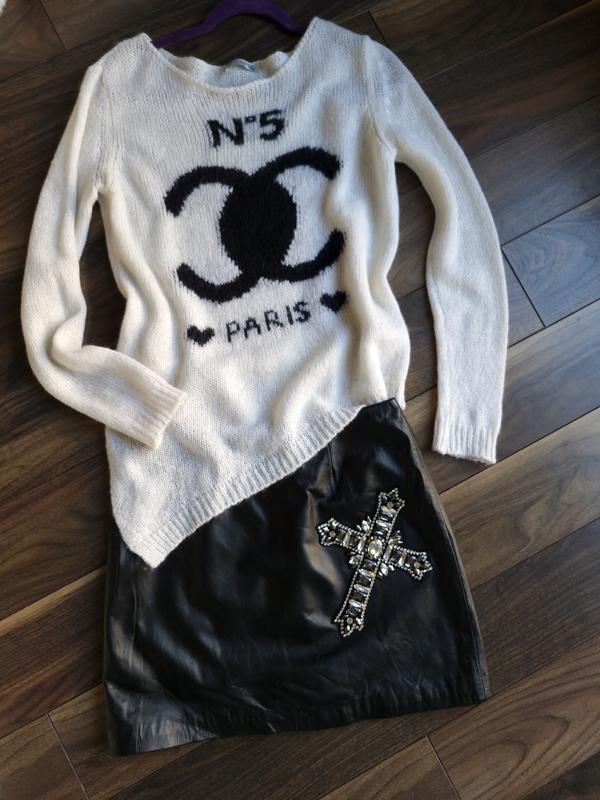 Свитер с надписью Chanel #5 Асимметричные края Размер М Замеры ПОГ -50, длина -56(73), рукав от ворота -72. юбка на фото кожаная Pinko, тоже в продаже Смотрите Мои объявления Подписывайтесь на мою страницу. В наличии много вещей и обуви итальянских брендов в отличном состоянии, новые. (не секонд!). Каждый день добавляю новинки!