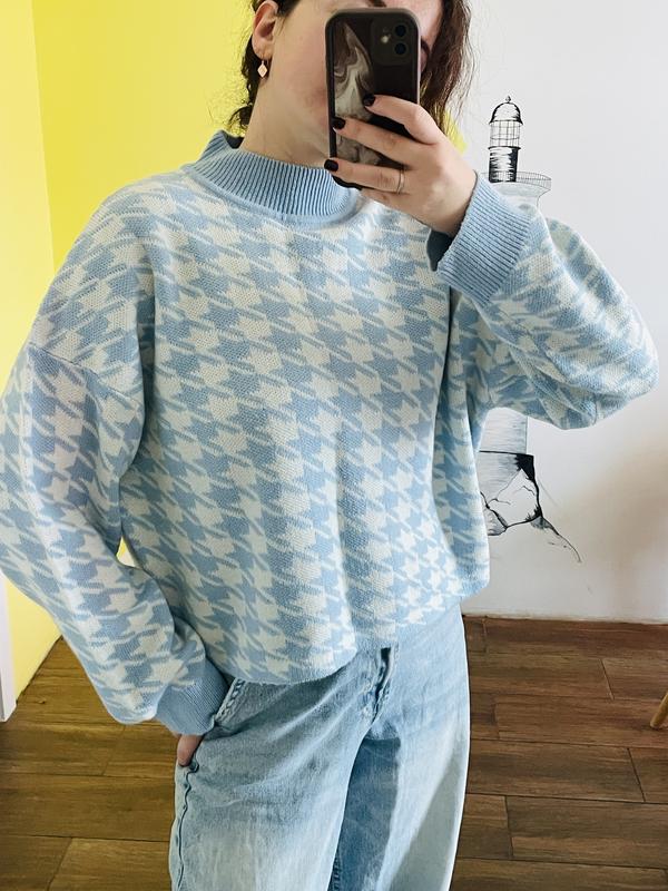 Продаю ніжний блакитний светр H&M в гусячу лапку. Зовсім не колеться та не чешеться, приємний ворот. Стан ідеальний, без нюансів. На бірці розмір Л, але спокійно може йти від Xs, дивлячись на скільки оверсайз любите. Мої параметри: зріст 166, розмір С/М