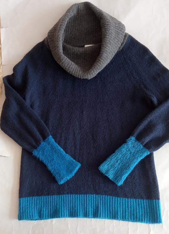 Свитер женский в очень хорошем состоянии в размере евро 44-46. Заг.дл- 74 Рукав -69 НОГ- 49 .Рукава манжет - травка . Ворот- хомут. Ткань мягкая и приятная к телу. В составе - акрил, нейлон, шерсть и эластан.