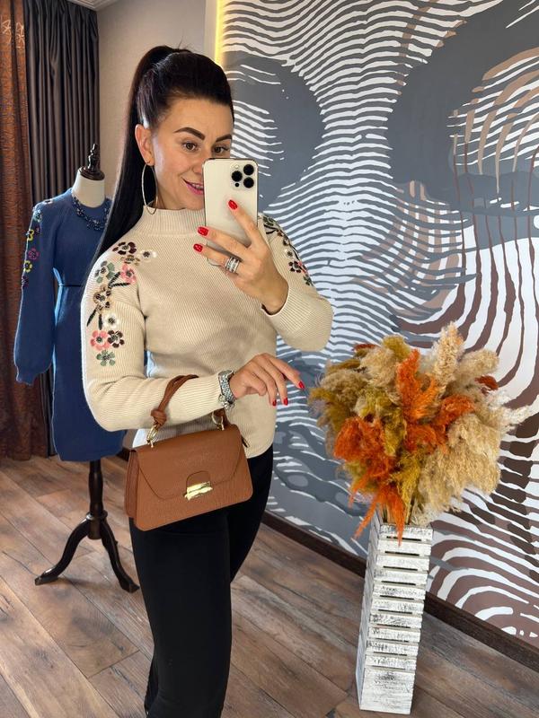 новинка сезону 🌸🌸 Очаровательный свитер свободного кроя с аккуратным воротником стойка выполнен из трикотажа машинной вязки с рельефным узором декорирован волшебной цветочной аппликацией. Cвитер отлично выглядит, он согреет вас в прохладное время года и станет незаменимой вещью вашего осенне-зимнего гардероба размер единственный 42-44 длина 58-60 см, полуобхват груди 47 см - хорошо тянется, длина рукава от шеи 68 см