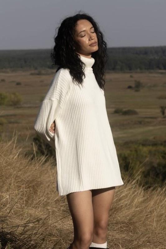 Жіночий молочний довгий прямий светр з подовженим вільним рукавом з воротом