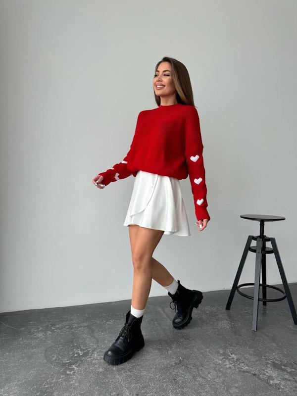 НОВИНКА Светр 💕 Модель:147 Розмір: oversize 42/46 Кольори: молоко , червоний та чорний Пряжа:акрил/вовна ЗАМІРИ: Н/ог 55 см Довжина по спинці:59 см Довжина рукава від шва:50 см