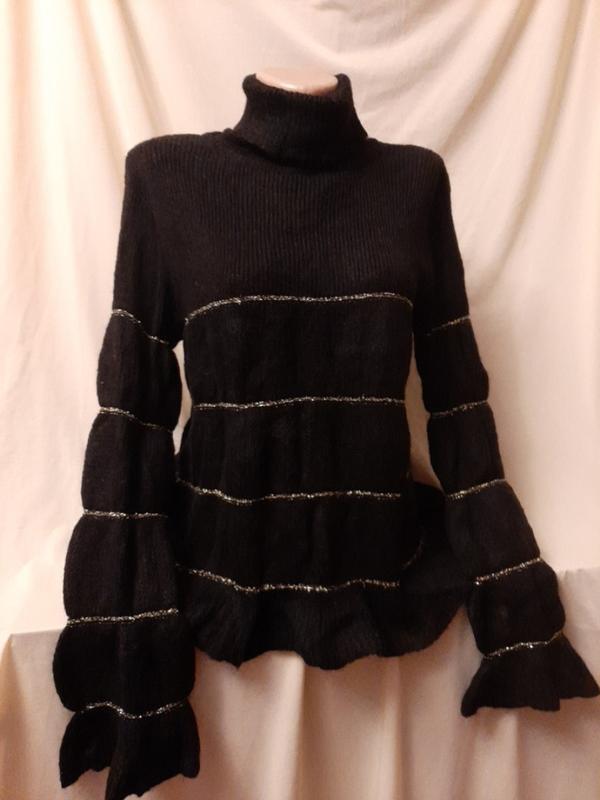 Теплый свитерик интересный фасончик, с люрексом и махер в составе, производствоТурция, на М/L: хомут - 20см с откатом, длина - 54, рукав - 65, ПОГ - 50+ тянетс я хорошо к 65, ПОБ - 54см в спокойном состоянии и тянется красиво