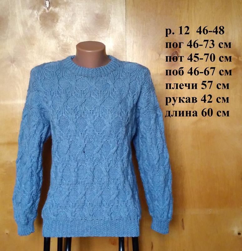 р 12 / 46-48 Теплый вязаный шерстяной свитер косы араны стальной голубой светр з вовни * Замеры в ровном виде и максимально потянув на фото. * Состав 100% шерсть ориентируясь на ощупь и запах при поджиге ниточки. Бирок нет - ручная работа. * Состояние очень хорошее. * Вязали на заказ, носили немного, присутствуют очень мелкие кашлатости под рукавами и оттеночные пятнышки. Нюансы в цене учтены. Цена 259 грн. Пересылаю Укрпочтой или Новой почтой по предоплате на карточку ПриватБанка.