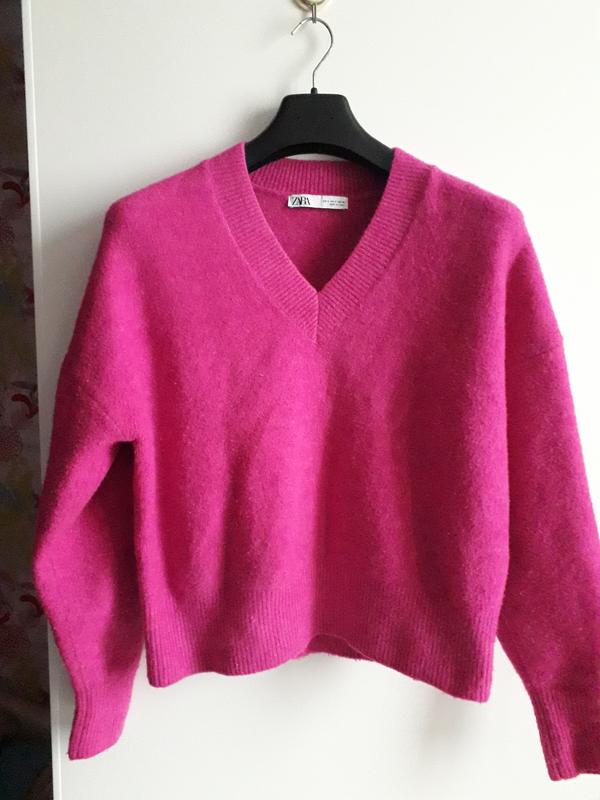 Ярко розовый свитер в очень хорошем состоянии, есть немного катышек. Размер указан S, но будет свободный, подходит и на М , L. Состав: 56 % акрил, 36 полиэстер, 4 шерсть, 4 эластан довольно тёплый.