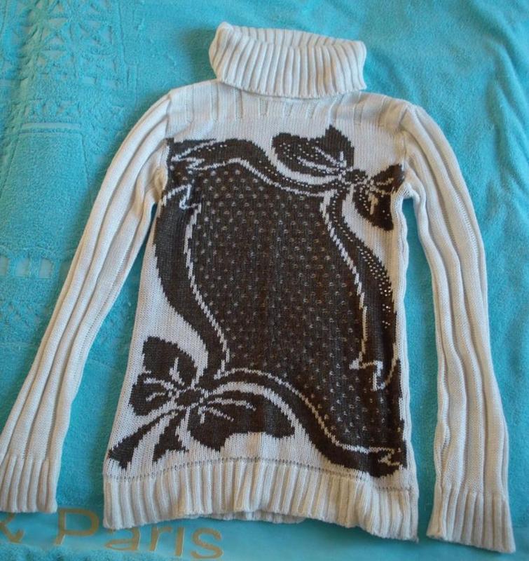 Красивый белый свитер. Состав: 50% шерсть, 50% акрил. Размер подходит на М Воротник туго проходит через голову