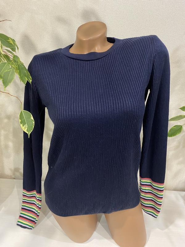 Свитер в рубчик с оригинальными манжетами в полоску. Известный бренд Стан идеален, без нюансов Темно-синий цвет Замеры: Длина от плеча - 59 ПОГ - 47/57 Ширина по низу - 44/54 Длина рукава - 60 Замеры в спокойном/ растянутом состоянии