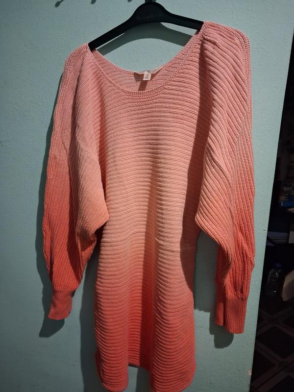 Довгий светр виконаний у дрібній в'язці. Рукава об'ємні, у стилі кажана