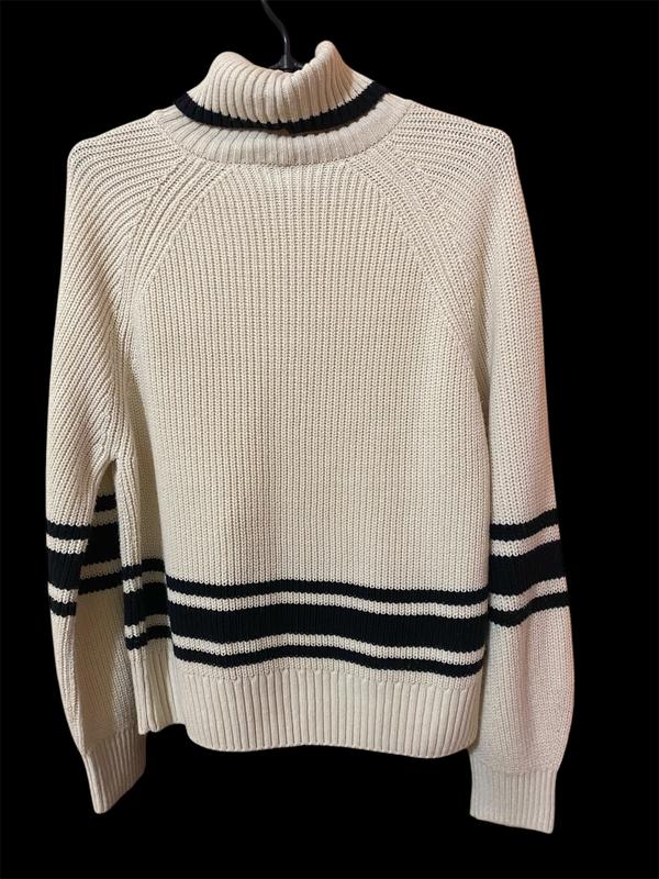 Женский свитер mango Рукав реглан длина от горловины 72 см Длина по спинке от горловины 57 см Ширина груди 56 см Размер S В составе хлопок большая часть Цвет молочный ( не белый) Полосы темно-синие Посадка обьемная