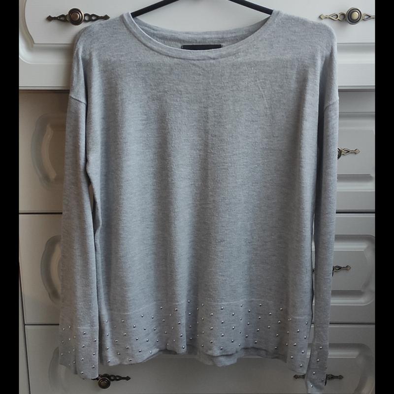 Кофта, светр Reserved сірого кольору в розмірі S, але підійде і на М (орієнтуйтеся по замірах нижче). Дуже приємний і м'який трикотаж, без дефектів. Єдиний момент це не вистачає однієї закльопки на манжеті (останнє фото), візуально не помітно. Заміри: довжина 56 см, ширина плечей (плечі приспущені) 51 см, довжина рукава від горловини 69 см, напів об'єм грудей 49,5 см, ширина по низу 48 см. Пересилаю Новою поштою і Укрпоштою, в тому числі і через безпечну оплату.