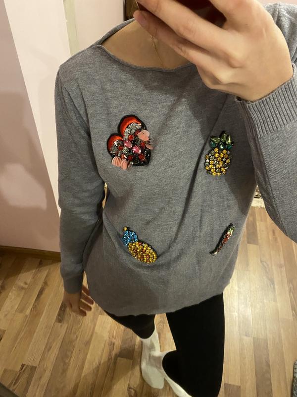 Кофтина серого цвета на длинный рукав, с интересными вставками спереди из камушек, удлиненная спинка, размер s-m