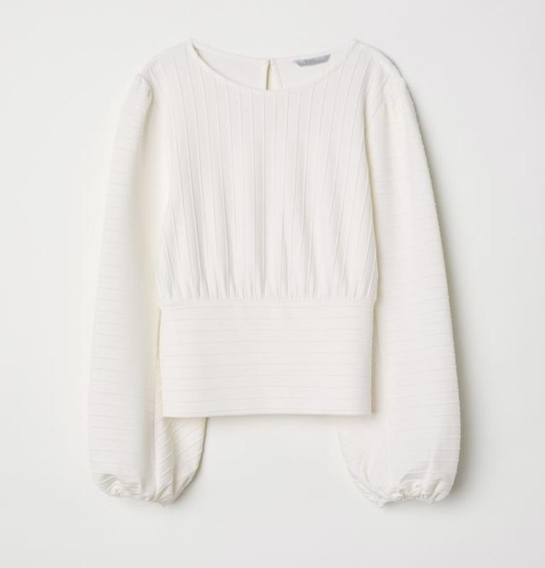 Топ из толстого трикотажа в текстурную полоску с длинными широкими рукавами-буфами и эластичными манжетами. Застежка сзади на пуговице. Ориентируйтесь на замеры Длина 55 Пог 55 Рукав 60
