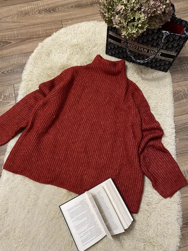 Свитер свободного кроя с широкими рукавами и боковыми разрезами на них, в насыщенном темно красном цвете, размер XL, можно L, состав полиэстер и акрил с примесью шерсти (4%), плотной вязки, длина 65см., полуобхват груди 68см., низ тоже 68см., длина рукава от горловины 77см., высота горловины 9см. Стан идеален. Все детали в профиле «про меня»!