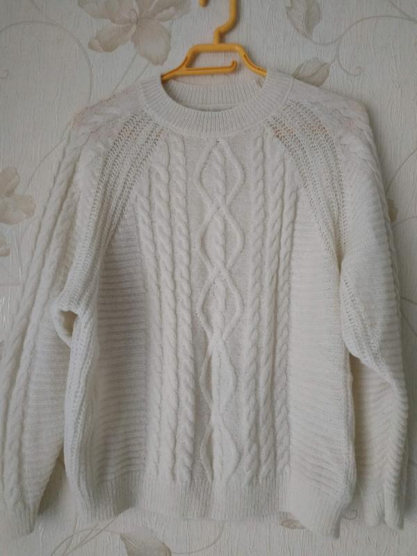 Красивый и теплый женский свитер белого цвета. Стан идеален. Можно надевать отдельно как свитер, можно комбинировать с рубашками