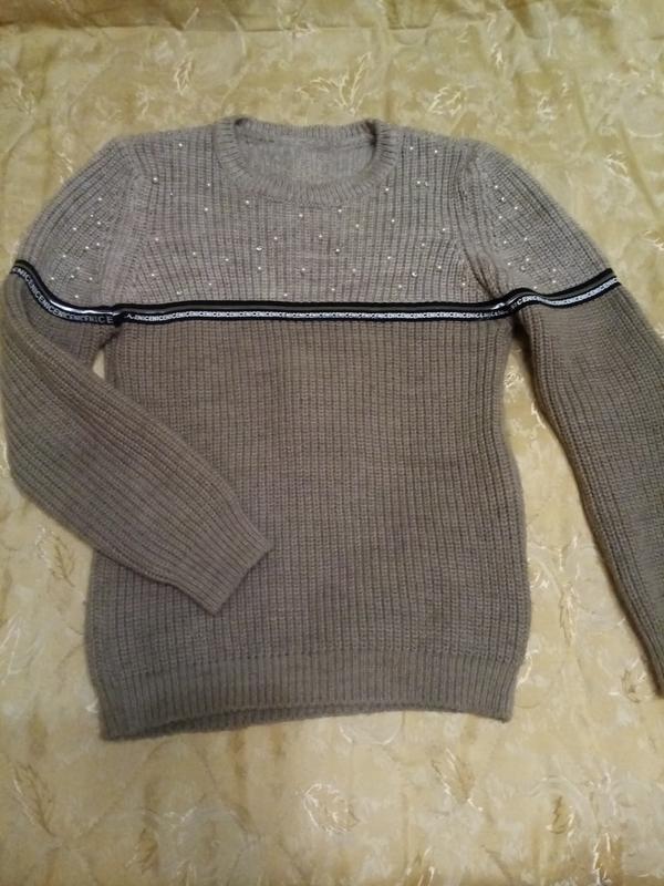 Теплый вязаный свитер в новом состоянии. Не подходит по размеру. Длина 56 см. Длина рукава от плеча 56 см. ПОГ 44 см, тянется до 52 см. Ширина плеч от 38 до 44 см. Бирку успела срезать. Украшен жемчужинами и стразами. По рукава у подмышки до 15 см. (т.е. обхват руки 30 см).