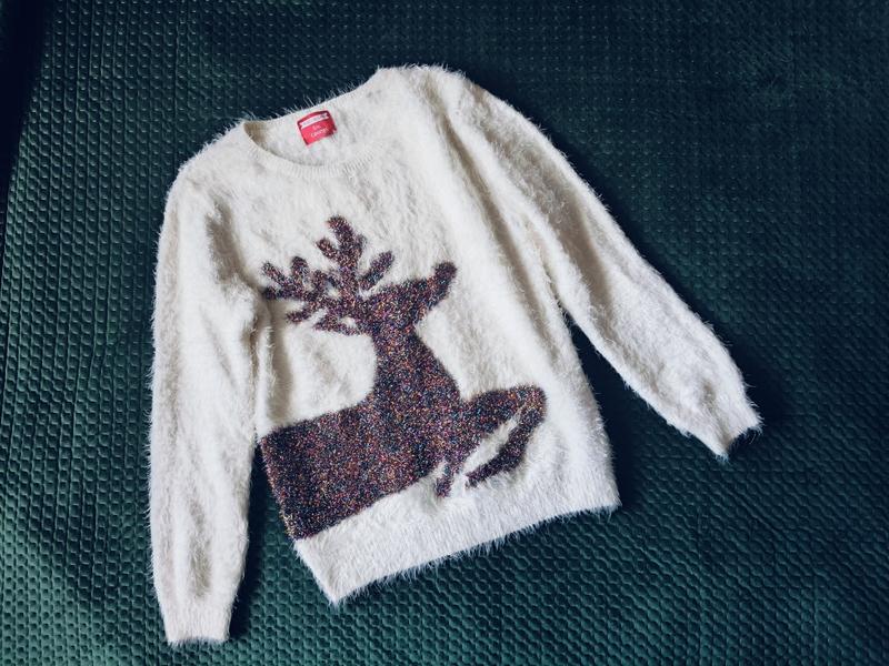 Свитер новогодний на размер 44-46, плечи 41 см, подмышки 48 см, длина рукава 61 см, длина 59 см