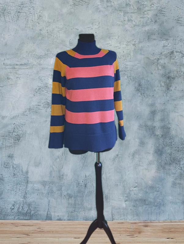 Стильный свитер с трендовыми полосками и высоким воротником, который идеально дополнит ваш зимний гардероб. 🔹 Размер: M 📏 Замеры: НОГ: 54см Длина по спинке без воротника:63см Воротник: 8см Длина рукава от воротника: 71см