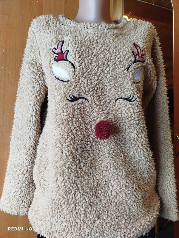 теплучий теди свитер с красивым принтом олененка цвет беж обхват груди 100 длина рукава 56 Довженка 70 ширина по низу 100