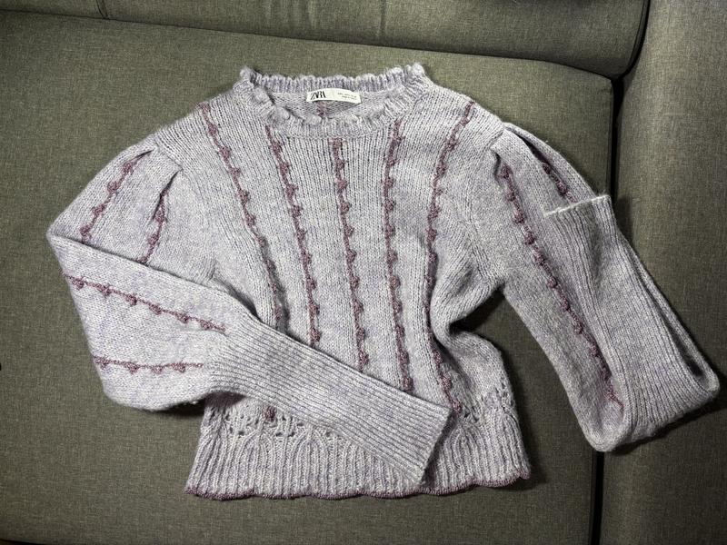 Свитер очень теплый, одевала всего раз (в жизни он приятного сиреневого-лавандового цвета) Размер пишет Л, но чуточку маломерит, то лучше к М