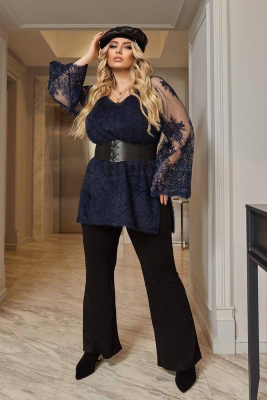 Матеріал: тепла в’язана тканина гарної розтяжності. Рукава- італійське мереживо: сітка з вишитим малюнком. Злегка блищить. З боків розрізи. Довжина 82 см 💥3р (54-58)- 108-122 см