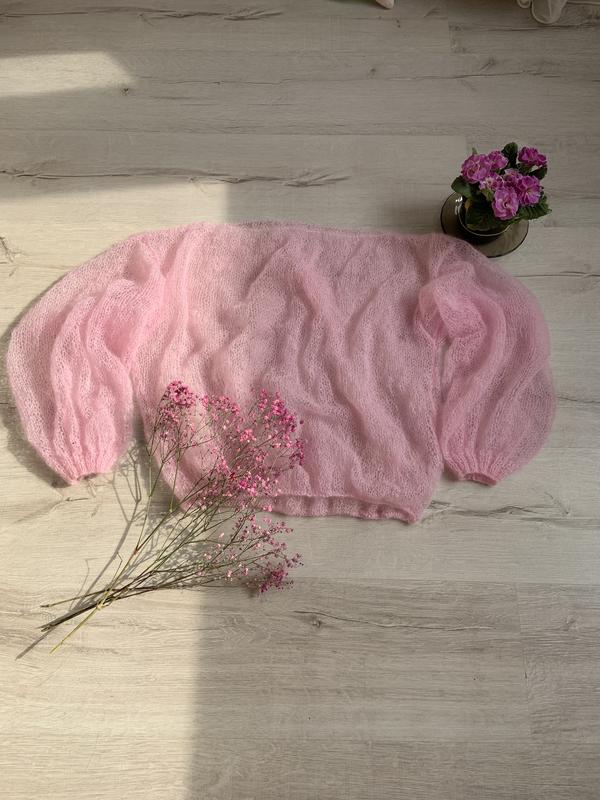 Укр, пошта- Післяплата- не відправляю !!! Легкий мов хмаринка, світер-павутинна із кід-мохеру. Колір ніжно-рожевий. Ручна робота ,в’язаний як оверсайз підходить на декілька розмірів S-M-L-XL. Заміри в спокійному стані: ширина-58см, довжина-54см. Ще є різні кольори в мене на сторінці. Не створюйте автоматичних замовлень без мене, всі питання до продажу !