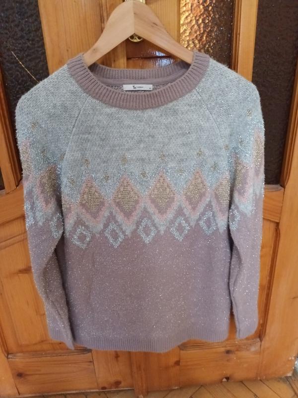Женский мирер с круглой горловиной серо-сиреневого цвета, в составе 72%акрил, длина 64-65см, длина 62см, полу.обх.грудь 50-52см, тянется в составе есть металлическая нить, придающая праздничный стиль, достаточно теплый не тонкий, с приятным принтом.