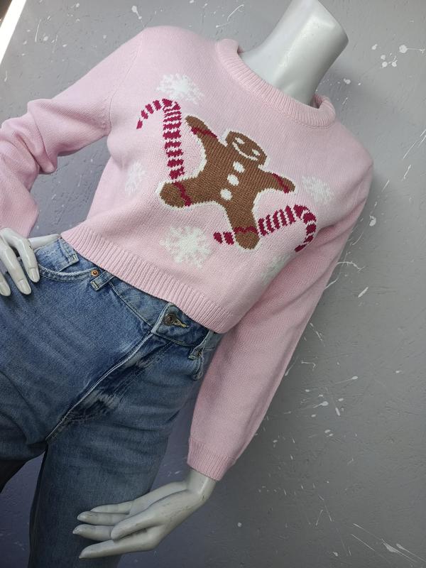 стильная кофточка плотной машинной вязки с круглой горловиной и новогодним принтом на бирке указан размер L подойдет на размер S/M