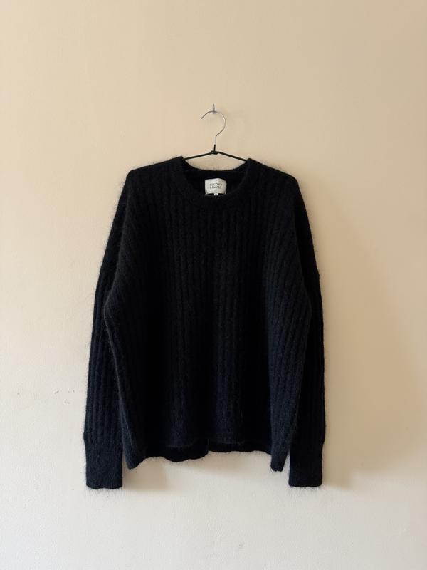 Стильный свитер оверсайз с разрезом на спине бренда Second Famale Дания. Размер M-L. Идеальное состояние, без нюансов. Состав: 34% мохер, 34% шерсть, 27% полиамид, 5% эластан. Цвет черный. Длина 61 см, пог 63 см, плечи спущенные, рукав от горловины 76 см.