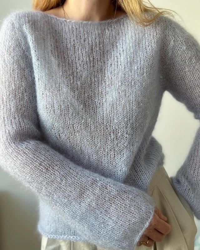 Базовый свитер оверсайз. С ним Вы создадите уютный образ, в то же время это незаменимая и удобная вещь в гардеробе. Отлично сочетается с платьем, юбками и джинсами с высокой посадкой. Сплетенный вручную из кид мохера.