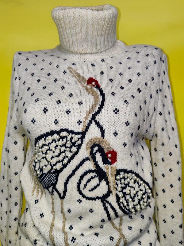 Теплий і м'який светрик. Виробництво Туреччина. Тендітні чаплі декоровані мушлями. Склад: вовна, акрил Розмір 42-44 Довжина по спині 64 см НОГ 40 см Довжина рукава 71 см Відстань між плечима 38 см