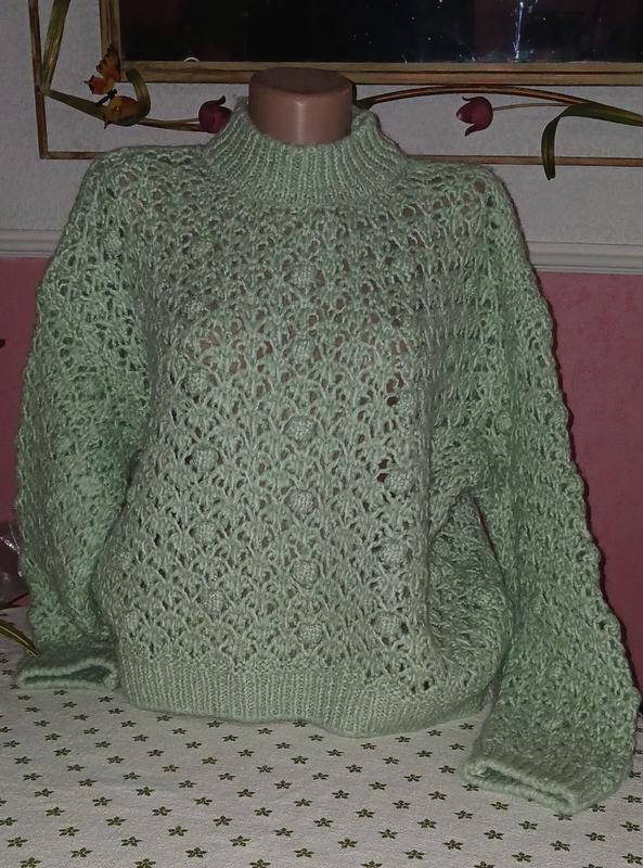 Укороченный свитер, фасон свободный, широкий, рукав прспущенный, красиво сядет на рост 155 -163., цвет нежный, спокойный. Свитер, не смотря на ажурное плетение, теплый и объемный. Размер указан s,но подойдёт и на м-л. Ориентация на замеры: длина свитера 55см длина рукава от горловины 72см объем по груди 120 объем по низу 106