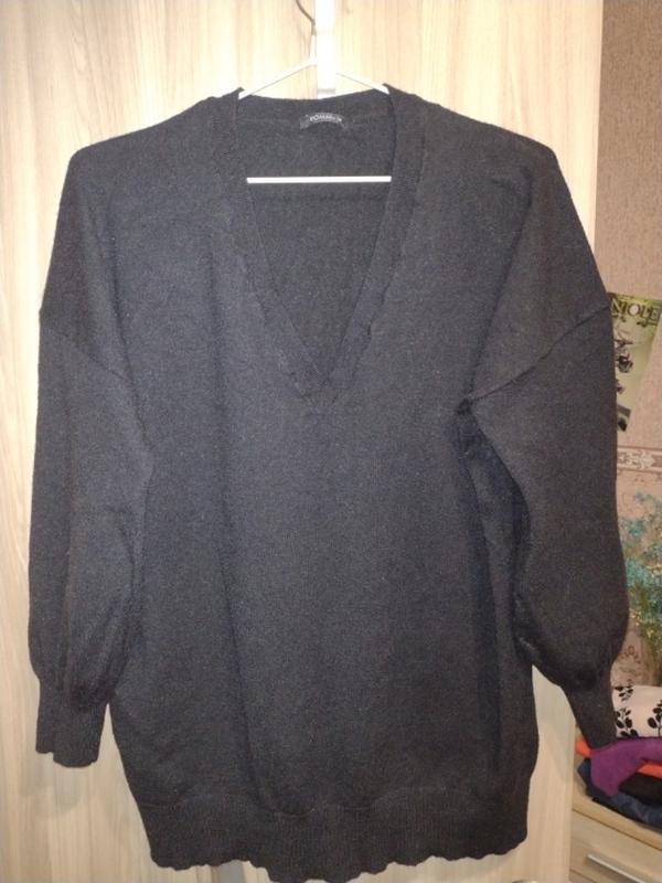 Теплый и мягкий женский джемпер, можно как туника, спущенным широким рукавом. Цвет насыщено черный,камера засветит.Не скатывается!!! Хорошо тянется. Размер 50-52. Смотрите замеры ог-57см от-57см низ-49см длина -70см рукав от горловины -65см