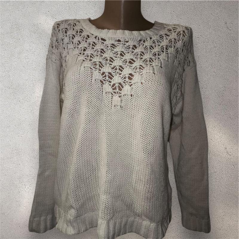 Біла вʼязана кофта з ажурними деталями на верхній частині. Гарний і ніжний варіант для повсякденного образу чи для особливих зустрічей. Ця модель виглядає як стильна укорочена кофта. Розмір M, також оверсайз посадка дозволяє носити цю кофту людям із розміром S, якщо бажаний більш вільний вигляд. Демісезонна Довжина виробу- 54 см Обхват грудей- 54-55 см Довжина рукава від горла- 67 см, від шву- 47 см