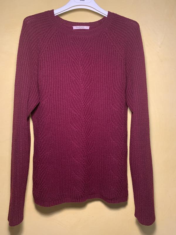Светр джемпер WoolOvers з круглим вирізом, попереду плетіння «коси». Ефектний, жіночний та затишний. Шикарна якість, дуже мʼякий і приємний до тіла. Нитка середньої щільності. Склад розкішний: мериносова вовна 80% merino wool, кашемір 20%. Cashmere Завжди актуальний колір - бордо / марсала Машинне прання. За рахунок плетіння (гумка) сідає на будь-який тип фігури. Зазначений розмір S, проте, на мій повний M сідає вільно. Еластичний. Краще орієнтуватися на заміри: довжина 64 см, ПОГ 50++см, рукав (реглан) від краю горловини 74 см, ширина горловини 16 см, низ 49+++см. Стан ідеальний. Old money. Ціна без торгу. Залишитесь задоволені!