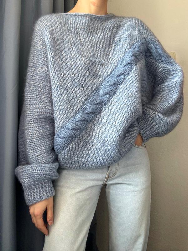 Объемный уютный свитер в голубом оттенке Хорошая вязка, приятный на ощупь На ощущение шерсти Бирки отсутствуют, ручная работа Стан - идеальный Размер универсальный Замеры: рукав от горловины-76 см, полуобхват груди ориентально-63 см, длина-67 см. Одето на размер S
